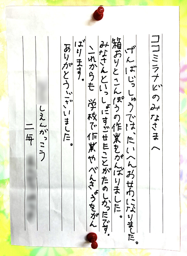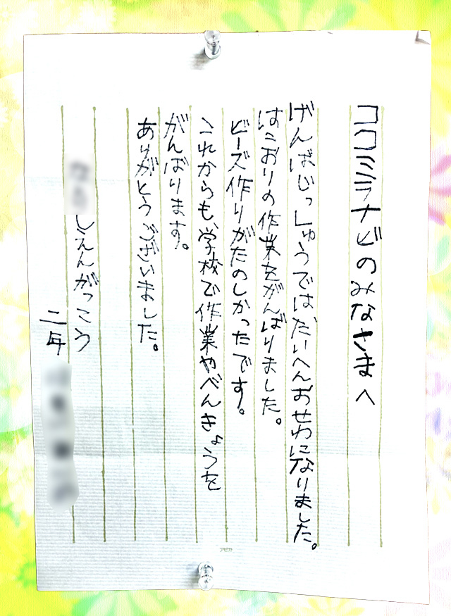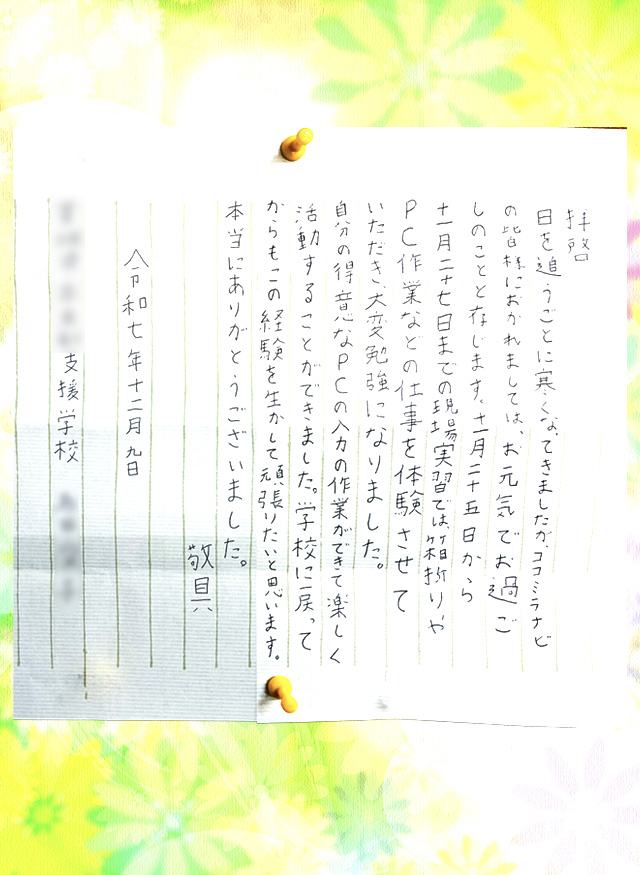 ココミラナビは現場実習にも対応しています。受け入れた支援学校の生徒さんから御礼のお手紙をいただいたので紹介させていただきます。